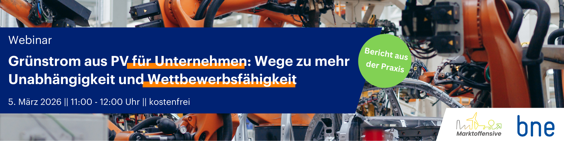 Die Marktoffensive Erneuerbare Energien und der Bundesverband Neue Energiewirtschaft (bne) laden Sie herzlich ein, am 05. März 2026 von 11:00 bis 12:00 Uhr beim Webinar dabei zu sein. Nutzen Sie die Gelegenheit, mit Unternehmen, die bereits PV in ihre Stromversorgung integriert haben, direkt ins Gespräch zu kommen und Fragen rund um die Erkenntnisse und operative Abwicklung zu stellen.
